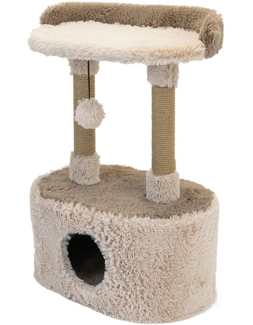 Домик с двумя когтеточками, большой полкой и игрушкой изготовлен из ДСП и ДВП, обработан пушистым мехом, столбики обработаны джутовой веревкой.