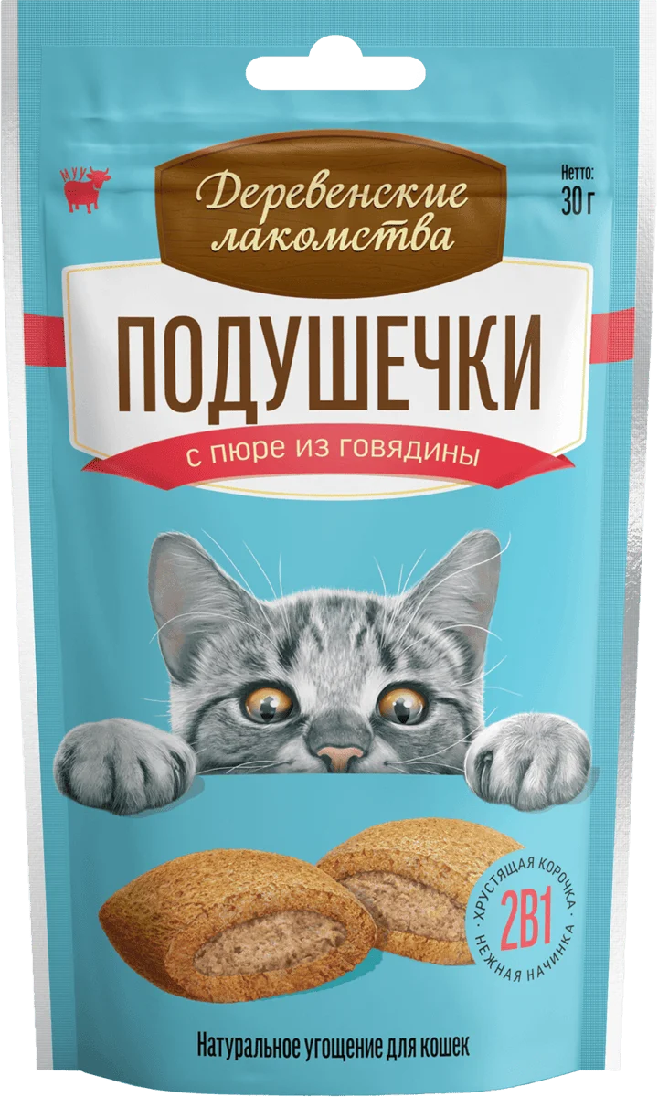 Великолепная комбинация из хрустящей корочки и нежнейшего натурального пюре из говядины делают это лакомство любимым угощением кошки, а пористая структура помогает питомцу чистить зубы.