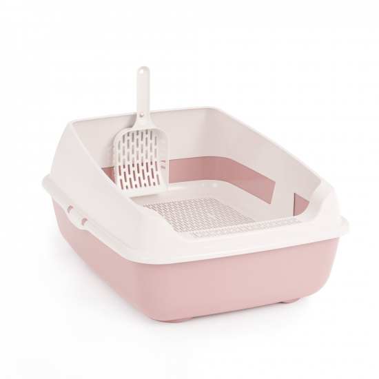 Лоток для кошек с высокими бортами, сеткой и совком изготовлен из прочного пластика, безопасен для здоровья питомца и не имеет посторонних химических запахов.