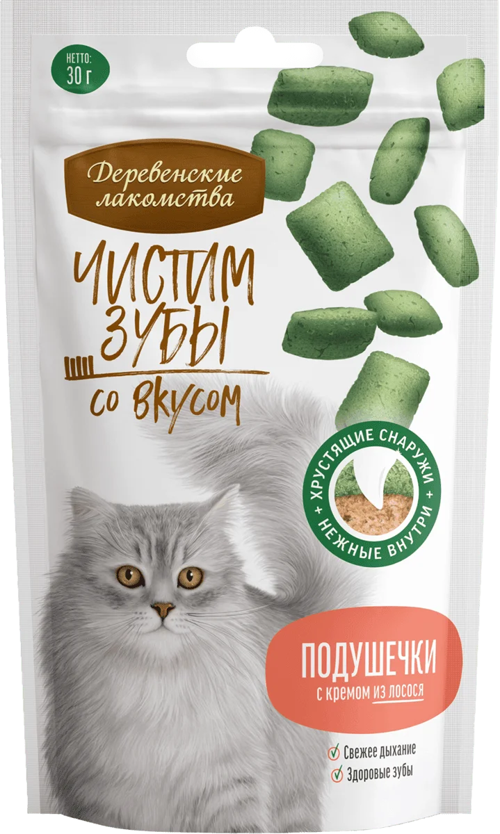Хрустящие подушечки с кремом из лосося, благодаря своей пористой структуре, удаляют зубной налет, предотвращают образование зубного камня и освежают дыхание. Начинка из нежного рыбного крема делает их любимым угощением кошек. Теперь чистить зубы не только просто, но и вкусно!
