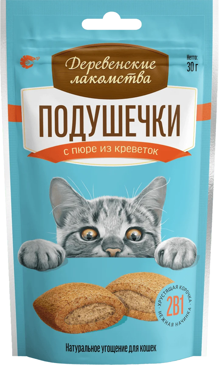 Великолепная комбинация из хрустящей корочки и нежнейшего натурального пюре из креветок делают это лакомство любимым угощением кошки, а пористая структура помогает питомцу чистить зубы.